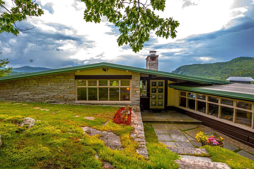 This Frank Lloyd Wright inspired clifftop home perched on the granite peak of Pear Mountain features one-of-a-kind, panoramic views thoughtfully paired with custom details throughout. Once through the gate, you are welcomed by the mountains and a top of the world feeling. Inside, the galley-style custom kitchen with breakfast nook looks out as the sun rises and fills the kitchen with morning light. The living room, office and dining room windows frame the valley, Kearsarge, Cranmore, the Moat Mountains and more. The two ensuite bedrooms with walk-in closets and their own laundry offer comfort and privacy while the guest room and rec room offer even more space for hosting. Used as a poker room by the first owner, the lower den is a unique space featuring a striking granite wall on one side, wrap-around windows on the other and a cozy fireplace in between. Distinctive, custom details including granite, slate, tray ceilings, barnboard and wainscoting are found throughout. Outside, sits an attached screened porch with a third fireplace, 6.7 acres for enjoying the mountain air, a one car garage with half bath and perennials filling the yard with summer color. Ideally located within reach of local amenities while providing a special, private mountain retreat.