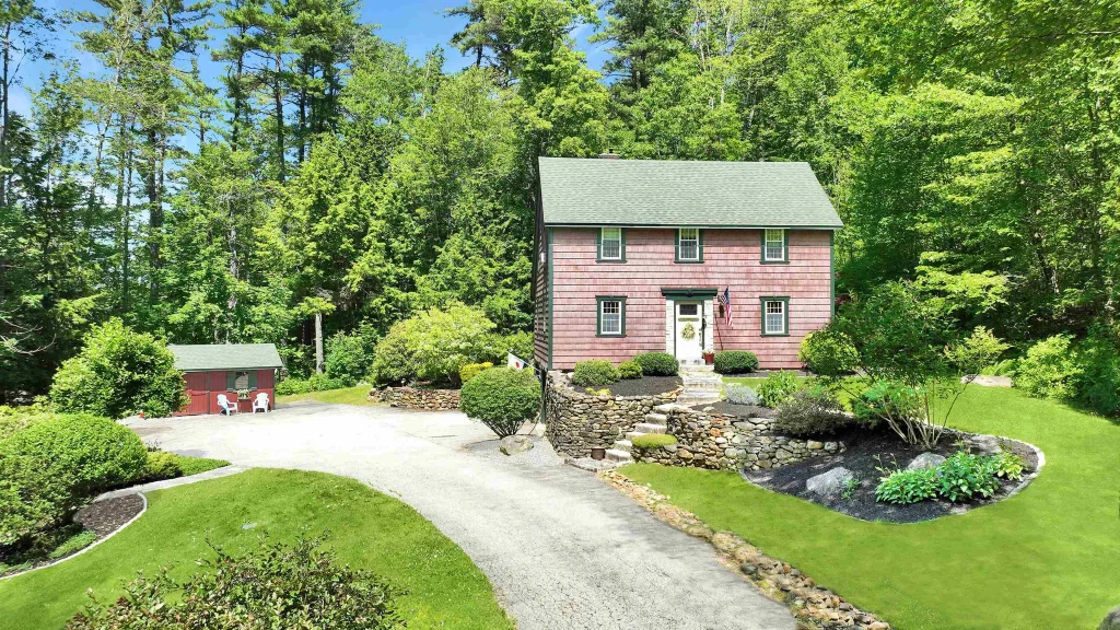Enjoy Antique home charm with none of the work! Discover the perfect blend of classic New England charm and thoughtful modern updates in this beautifully crafted Antique Reproduction Saltbox Colonial, set on 1.76 private, landscaped acres. Built in 1979, this home features wide pine floors, custom woodwork, and period-style finishes throughout, down to the light fixtures and door latches. The formal living room offers rich wood paneling, Indian shutters, and a brick fireplace. A spacious kitchen with CAFE appliances (new in 2024) and granite countertop is open to the dining room with gas stove, for easy entertaining. Step down into a stunning sunroom featuring arched wood beams with french doors to the patio and gardens. A full bath and guest bedroom or office complete the first floor. Upstairs includes a primary suite with a walk-in closet, a 2nd bedroom, and full bath. A laundry room and office are on the lower level, plus a 2-car garage. Outdoors, enjoy stone walls, granite steps, perennial gardens, an oversized Amish-built shed, and gazebo. When the leaves fall, enjoy seasonal mountain views from the upper level. Located minutes from downtown Jaffrey and the trails of Mount Monadnock, this home offers peace, privacy, and unmatched New England style! Come experience this one-of-a-kind property today!