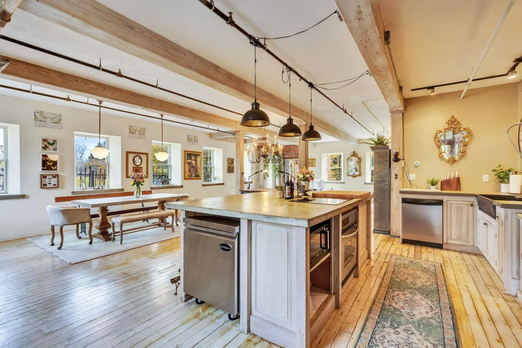 Featured in Country Living magazine, this second-story loft, created by New Hampshire artist and chef Dan Thibeault, is a true one-of-a-kind. Set in a renovated riverside mill in Peterborough, the 1,614 sq ft, 2-bedroom residence blends drama and warmth: soaring ceilings with exposed beams, an oversized kitchen island with seating, a formal dining area, and a generous living space. Transom-topped doorways lead to two bedrooms plus a cozy reading nook/bonus room. A large laundry room adds everyday ease, and the spa-like bath showcases exposed brick and a walk-in shower. Step outside to a trellised, 50-ft balcony, perfect for container gardens and morning coffee overlooking the river. Notable artisan details abound: a gold-leafed archway from France, historic church doors from Belgium, antique pocket doors, a solid marble bath sink, and elevator access. Monthly fee includes heat, hot water, internet, water, sewer, trash, snow removal, landscaping, pest control, and master insurance, predictable costs with no surprise bills. Walk to Adams Playground (pool, tennis, skate park), MacDowell Dam trails, Nature’s Green Grocer, and the shops, dining, and culture of downtown Peterborough. A spacious, magazine-worthy loft that lives artfully and effortlessly.