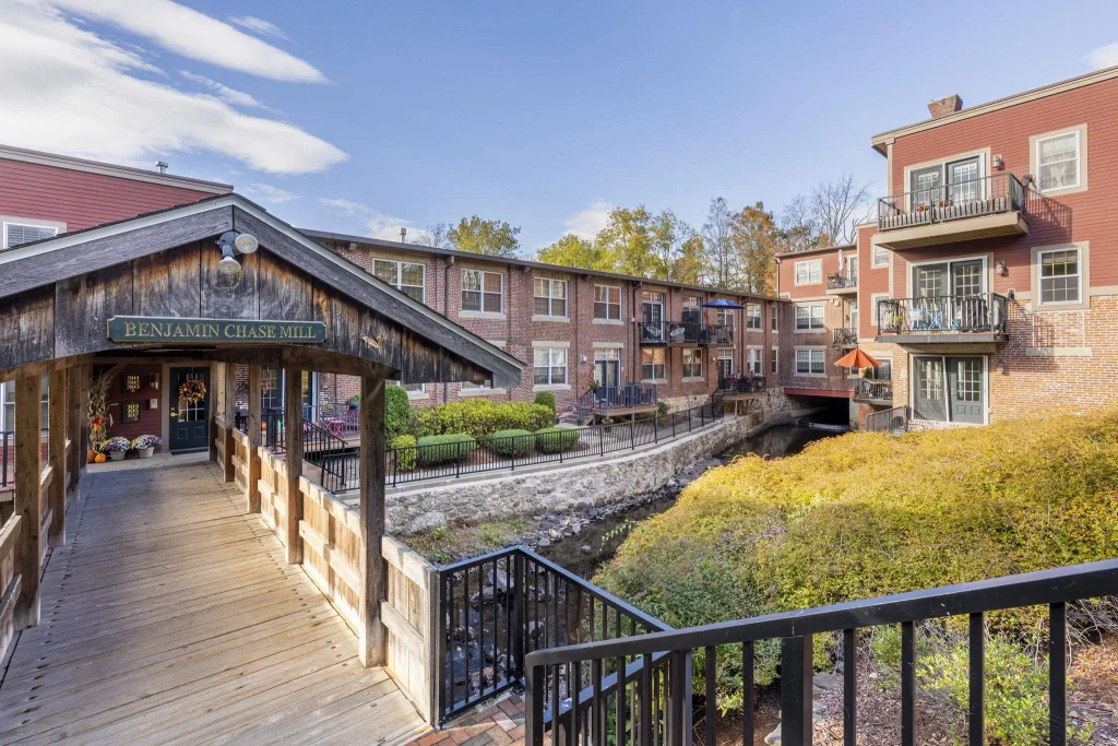 Unique Opportunity in Benjamin Chase Mill: Private entrance at ground level, gorgeous views of the stream, 2 Levels of outdoor spaces. When you enter on the main level, you'll see the a wide open living spaces including modern kitchen, dining room, living room with gas fireplace, balcony overlooking the water, 1/2 bath and space for an office nook. You'll love this area has high ceilings, exposed brick, huge windows with tons of natural light. The kitchen has newer appliances and granite counters ready for your culinary adventures. New easy to care for luxury vinyl plank floors. Descend the stairs to the sleeping quarters. There you will find two bedrooms, both with ensuite full bathrooms, laundry room and utility closet. The primary suite has a walk in closet, dual vanity bathroom and PRIVATE PATIO with double doors to the water views. This special condo's layout allows so much privacy and peace with only your unit above the bedrooms. The association has two gazebos in the common areas and access to the Beaver Brook Walking Trail. Conveniently located near shopping and dining. Close to commuting routes Interstate 93 and Rt 101. A lovely opportunity to call this place home. Quick close possible.